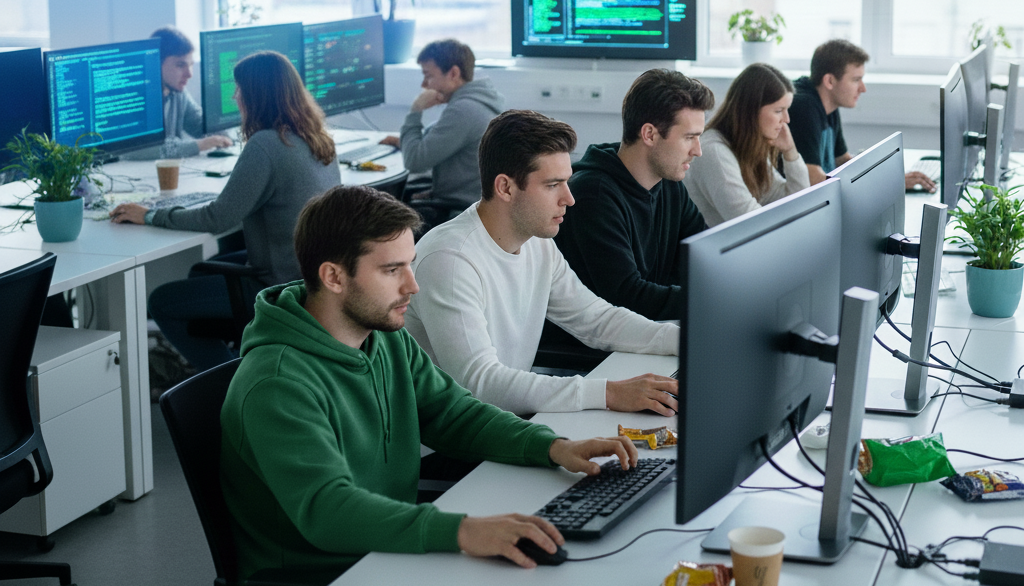 多くのメンバーがオフィスに泊まり込み、夜通しで問題に挑戦。エナジードリンクとお菓子とともに、ひたすらキーボードを叩き続けます。