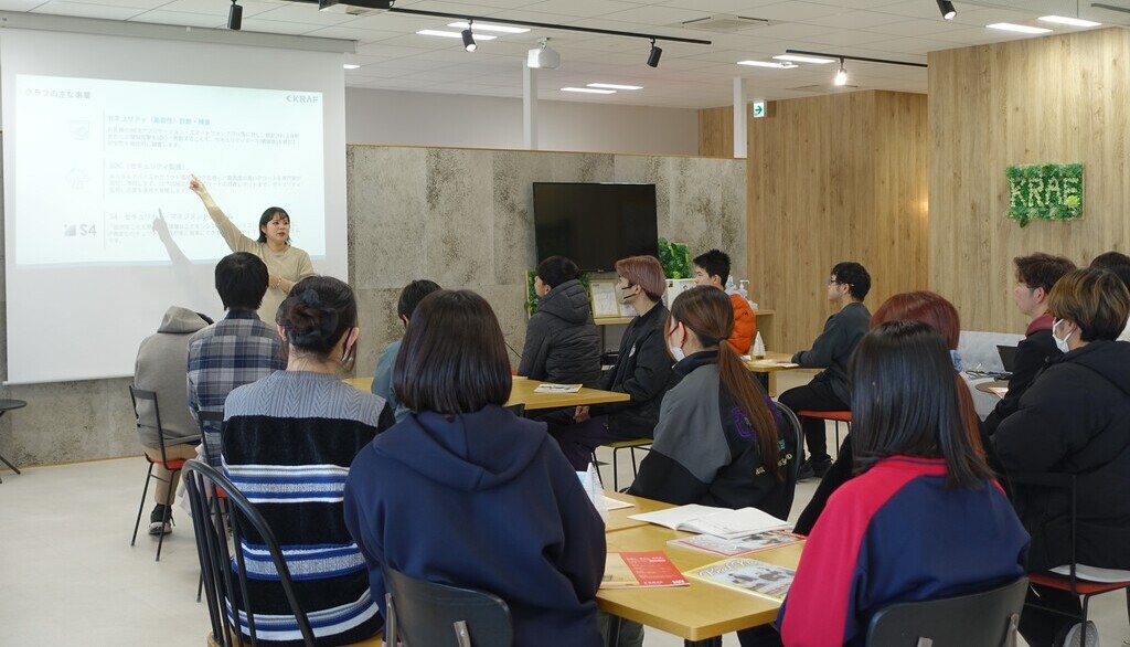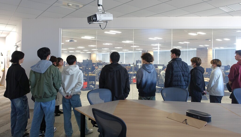 先日、宮崎情報ビジネス専門学校の皆様が企業見学のため来社されました。約50名の学生に向け、広報の宮本が事業内容のご紹介やオフィスツアーを行いました。